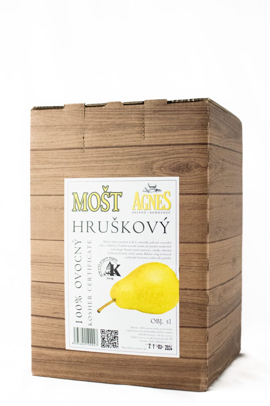 Agnes Mošt Hruškový 5l BIB je pasterizovaný hruškový mošt, který je balený v bag-in-box (BIB) krabici. Tento mošt je vyroben z 100 % hrušek a je bohatý na vitamíny A, B, C, minerály a pektiny. Obsahuje také ovocný cukr a vlákninu