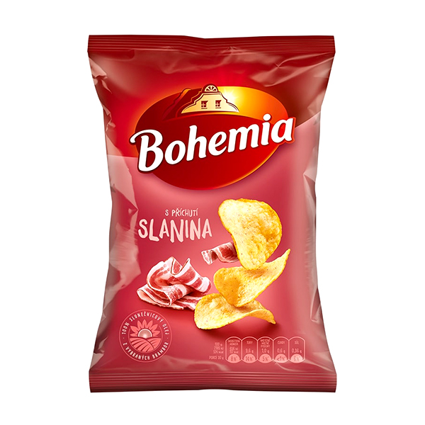 Chips Bohemia moravská slanina jsou chutnou a originální variantou oblíbených bramborových lupínků. Tyto chipsy jsou smažené v rostlinném oleji a ochucené speciálním aromatem, které jim dodává výraznou a slanou příchuť moravské slaniny. Chips Bohemia moravská slanina 70g jsou ideální jako svačina nebo jako doplněk k pivu, vínu nebo jinému nápoji.